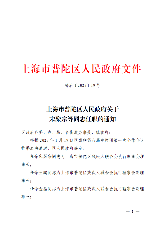 任命宋聚宗同志为上海市普陀区残疾人联合会执行理事会理事长;