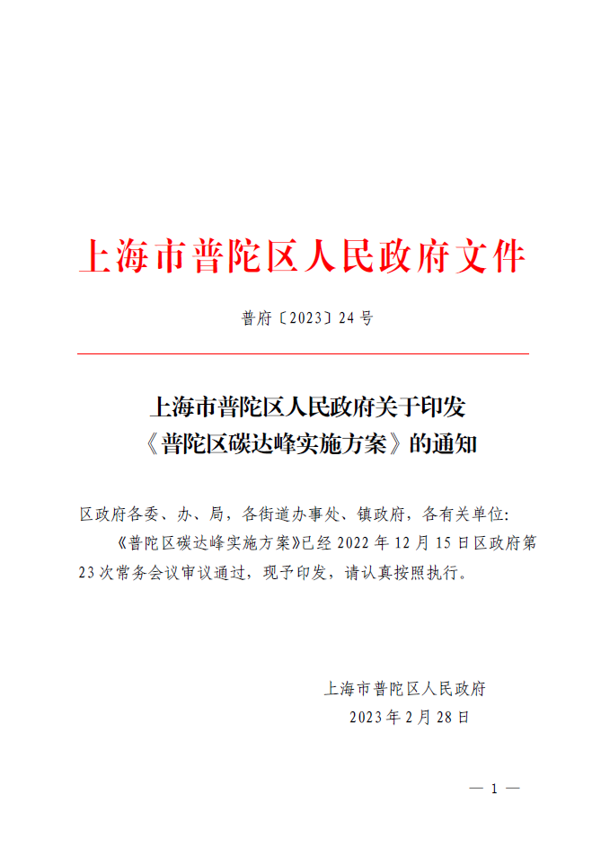上海市普陀区人民政府关于印发《普陀区碳达峰实施方案》的通知