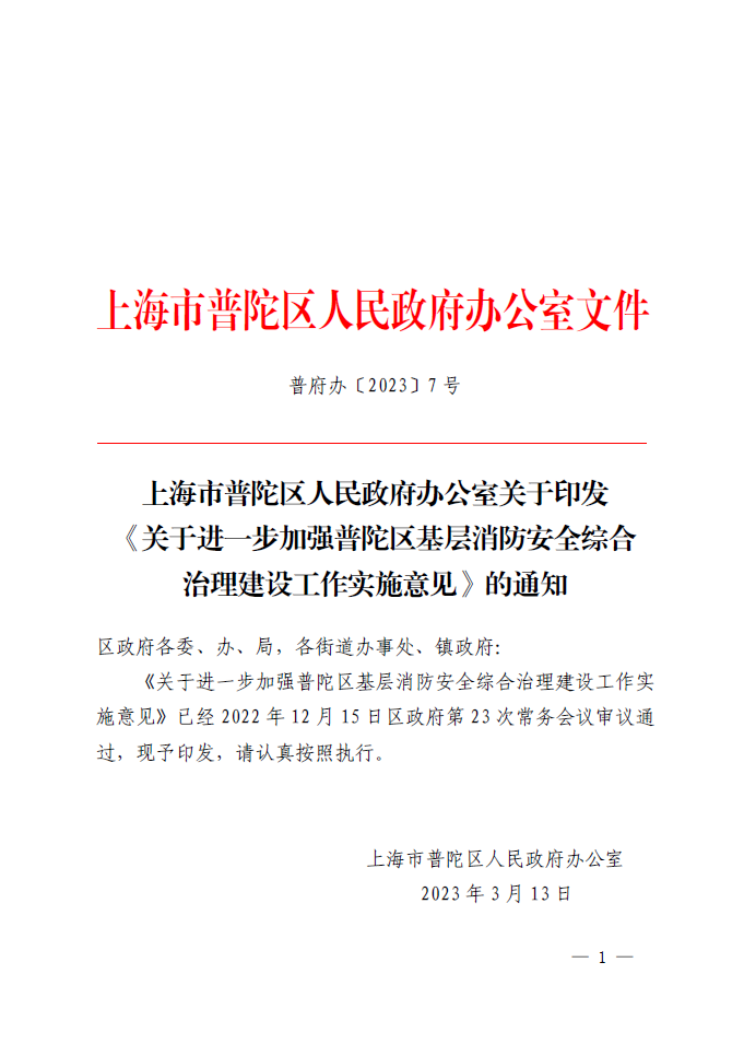 《关于进一步加强普陀区基层消防安全综合治理建设工作实施意见》已经2022年12月15日区政府第23次常务会议审议通过,现予印发,请认真按照执行。