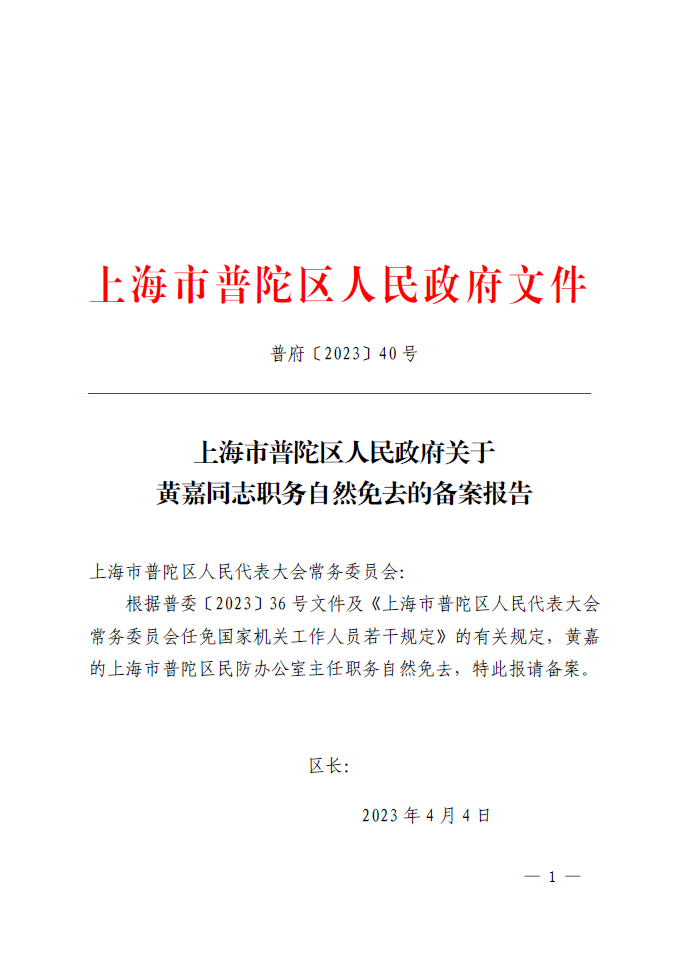 根据普委〔2023〕36号文件及《上海市普陀区人民代表大会常务委员会任免国家机关工作人员若干规定》的有关规定,黄嘉的上海市普陀区民防办公室主任职务自然免去,特此报请备案。