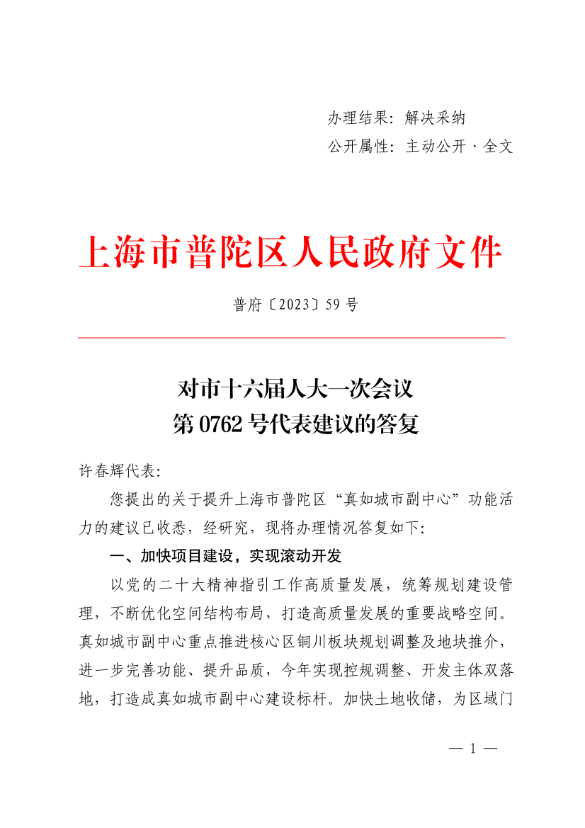 您提出的关于提升上海市普陀区“真如城市副中心”功能活力的建议已收悉,经研究,现将办理情况答复如下: