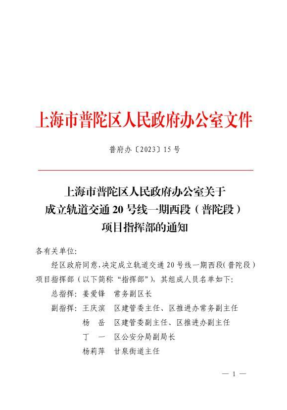 上海市普陀区人民政府办公室关于成立轨道交通20号线一期西段(普陀段)项目指挥部的通知
