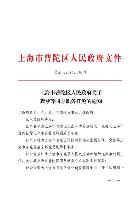 任命龚琴为上海市普陀区生态环境局副局长,免去其上海市普陀区绿化和市容管理局副局长职务;