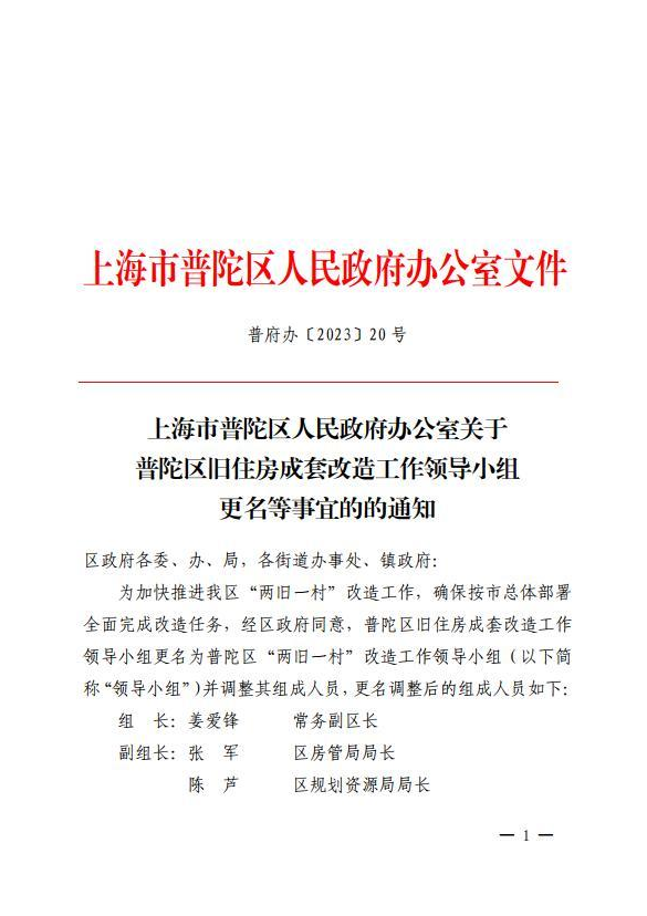 为加快推进我区“两旧一村”改造工作,确保按市总体部署全面完成改造任务,经区政府同意,普陀区旧住房成套改造工作领导小组更名为普陀区“两旧一村”改造工作领导小组(以下简称“领导小组”)并调整其组成人员,更名调整后的组成人员如下:
