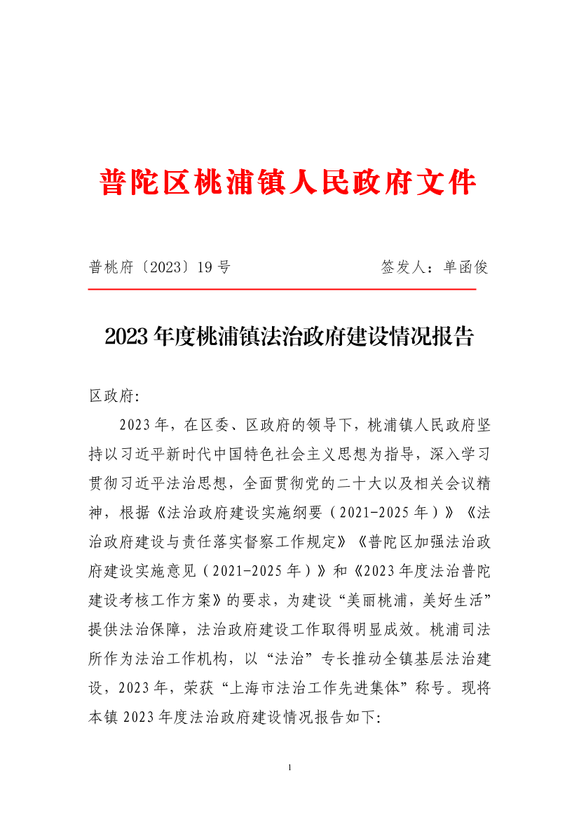 2023年,在区委、区政府的领导下,桃浦镇人民政府坚持以习近平新时代中国特色社会主义思想为指导,深入学习贯彻习近平法治思想,全面贯彻党的二十大以及相关会议精神,根据《法治政府建设实施纲要(2021-2025年)》《法治政府建设与责任落实督察工作规定》《普陀区加强法治政府建设实施意见(2021-2025年)》和《2023年度法治普陀建设考核工作方案》的要求,为建设“美丽桃浦,美好生活”提供法治保障,法治政府建设工作取得明显成效。桃浦司法所作为法治工作机构,以“法治”专长推动全镇基层法治建设,2023年,荣获“上海市法治工作先进集体”称号。现将本镇2023年度法治政府建设情况报告如下: