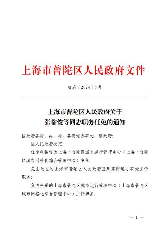 任命张临俊为上海市普陀区城市运行管理中心(上海市普陀区城市网格化综合管理中心)主任;