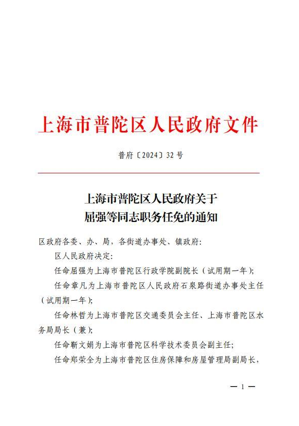 上海市普陀区人民政府关于屈强等同志职务任免的通知