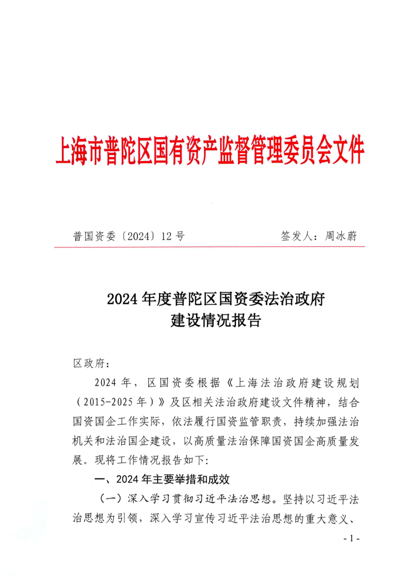 2024年,区国资委根据《上海法治政府建设规划(2015-2025年)》及区相关法治政府建设文件精神,结合国资国企工作实际,依法履行国资监管职责,持续加强法治机关和法治国企建设,以高质量法治保障国资国企高质量发展。现将工作情况报告如下:
