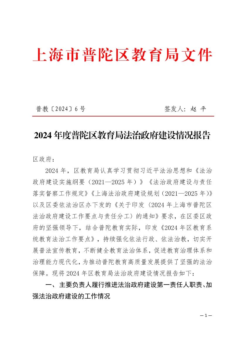 1.加强组织领导,履行法治政府建设职责。贯彻落实习近平总书记全面依法治国新理念新思想新战略,加强区教育局法治建设组织领导,自觉增强领导干部“关键少数”法治意识,制定《上海市普陀区教育局党政主要负责人履行推进法治建设第一责任人职责清单》《2024年普陀区教育局领导干部应知应会党内法规和法律法规清单》《2024年普陀区教育局普法责任清单》,围绕以法治思维和法治方式谋划并推进教育工作开展情况作专题述法,全面落实党政主要负责人履行推进法治建设第一责任人职责及法治政府建设督查考核工作,推动教育高质量发展。