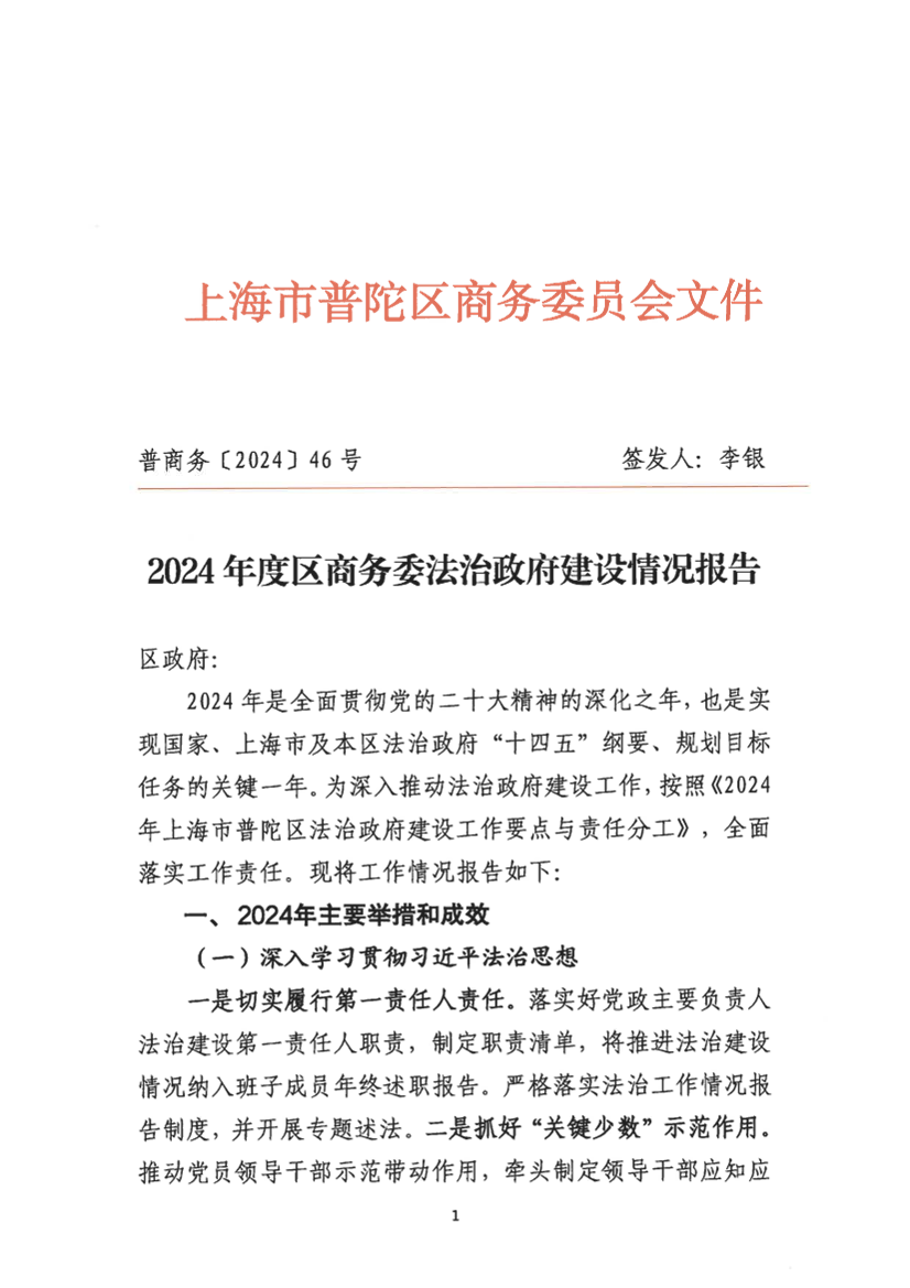 2024年是全面贯彻党的二十大精神的深化之年,也是实现国家、上海市及本区法治政府“十四五”纲要、规划目标任务的关键一年。为深入推动法治政府建设工作,按照《2024年上海市普陀区法治政府建设工作要点与责任分工》,全面落实工作责任。现将工作情况报告如下: