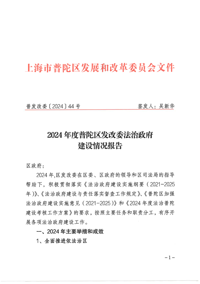 2024年,区发改委在区委、区政府的领导和区司法局的指导帮助下,积极贯彻落实《法治政府建设实施纲要(2021-2025年)》、《法治政府建设与责任落实督查工作规定》、《普陀区加强法治政府建设实施意见(2021-2025)》和《2024年度法治普陀建设考核工作方案》的要求,按照主要任务和职责分工,有序开展各项法治政府建设工作。