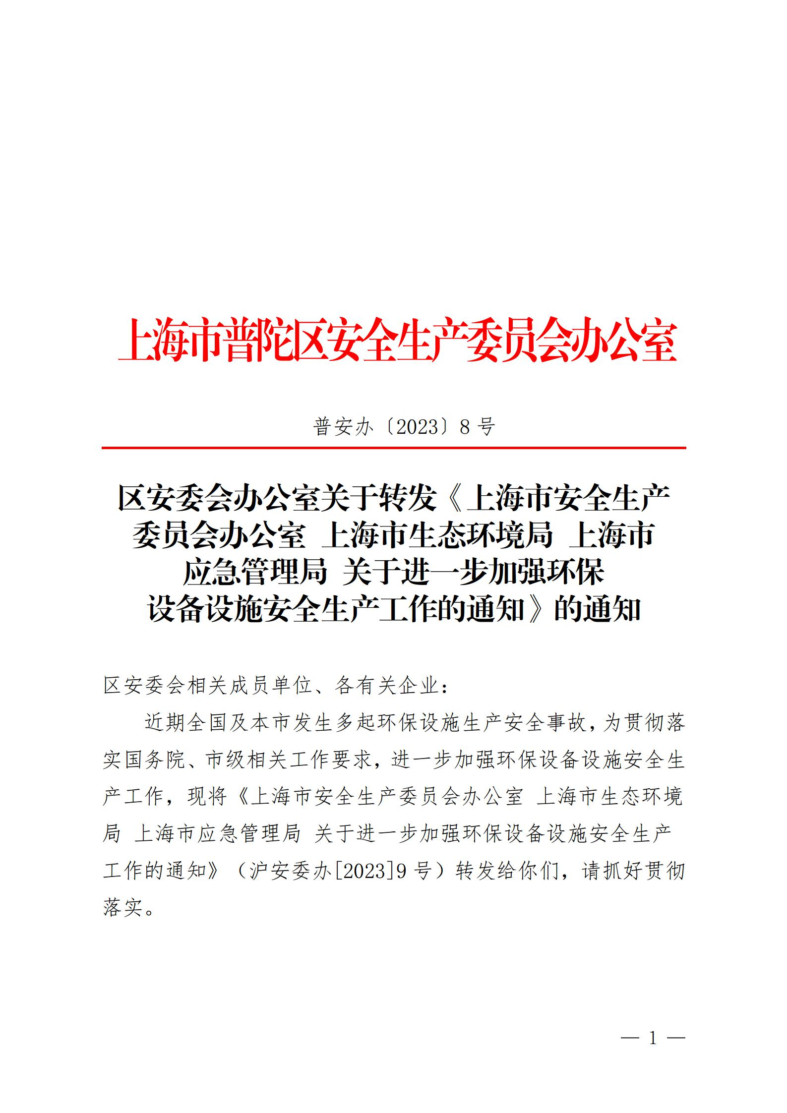 近期全国及本市发生多起环保设施生产安全事故,为贯彻落实国务院、市级相关工作要求,进一步加强环保设备设施安全生产工作,现将《上海市安全生产委员会办公室 上海市生态环境局 上海市应急管理局 关于进一步加强环保设备设施安全生产工作的通知》(沪安委办[2023]9号)转发给你们,请抓好贯彻落实。
