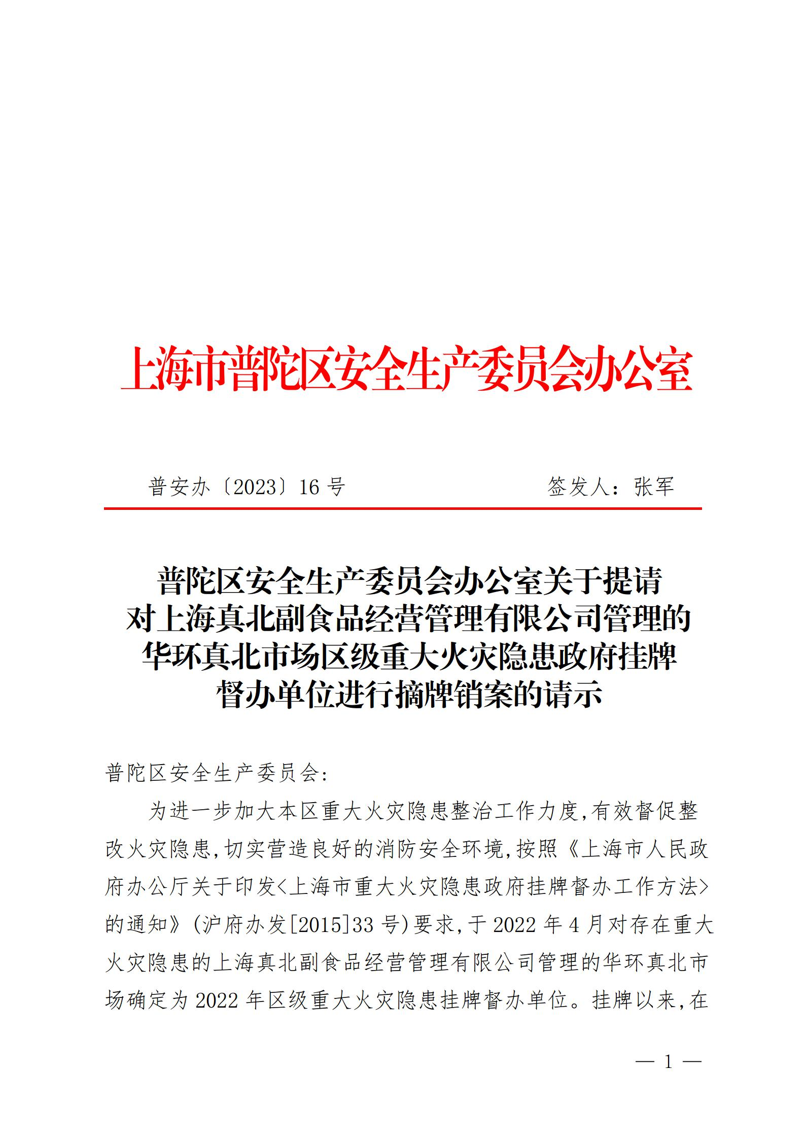 附件:普陀区消防救援支队关于对上海真北副食品经营管理有限公司管理的华环真北市场(普陀区域)区级重大火灾隐患政府挂牌督办单位进行摘牌销案的请示