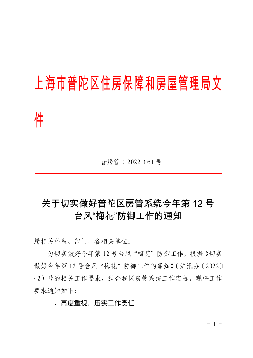 关于切实做好普陀区房管系统今年第12号台风“梅花”防御工作的通知