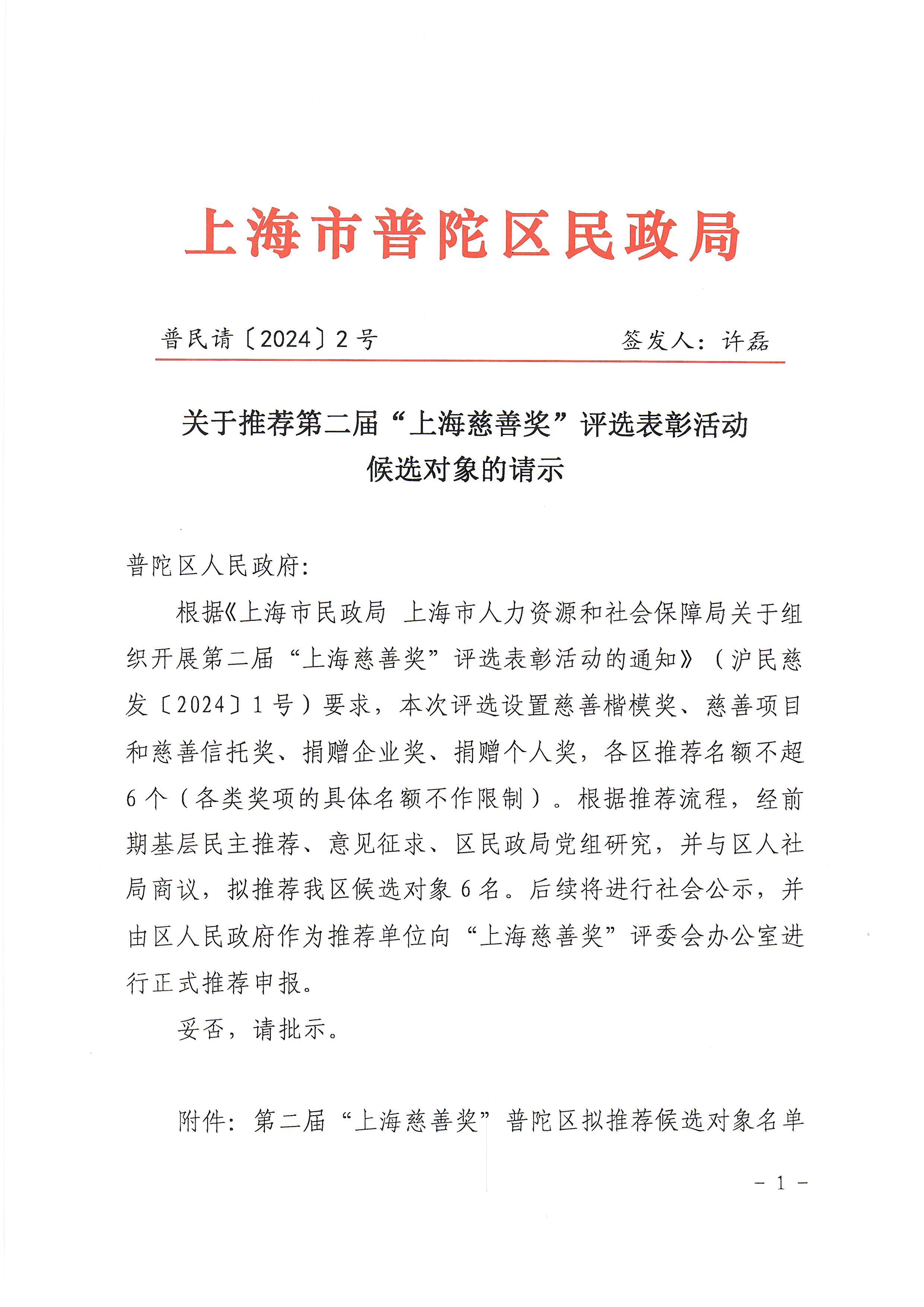 关于推荐第二届“上海慈善奖”评选表彰活动候选对象的请示