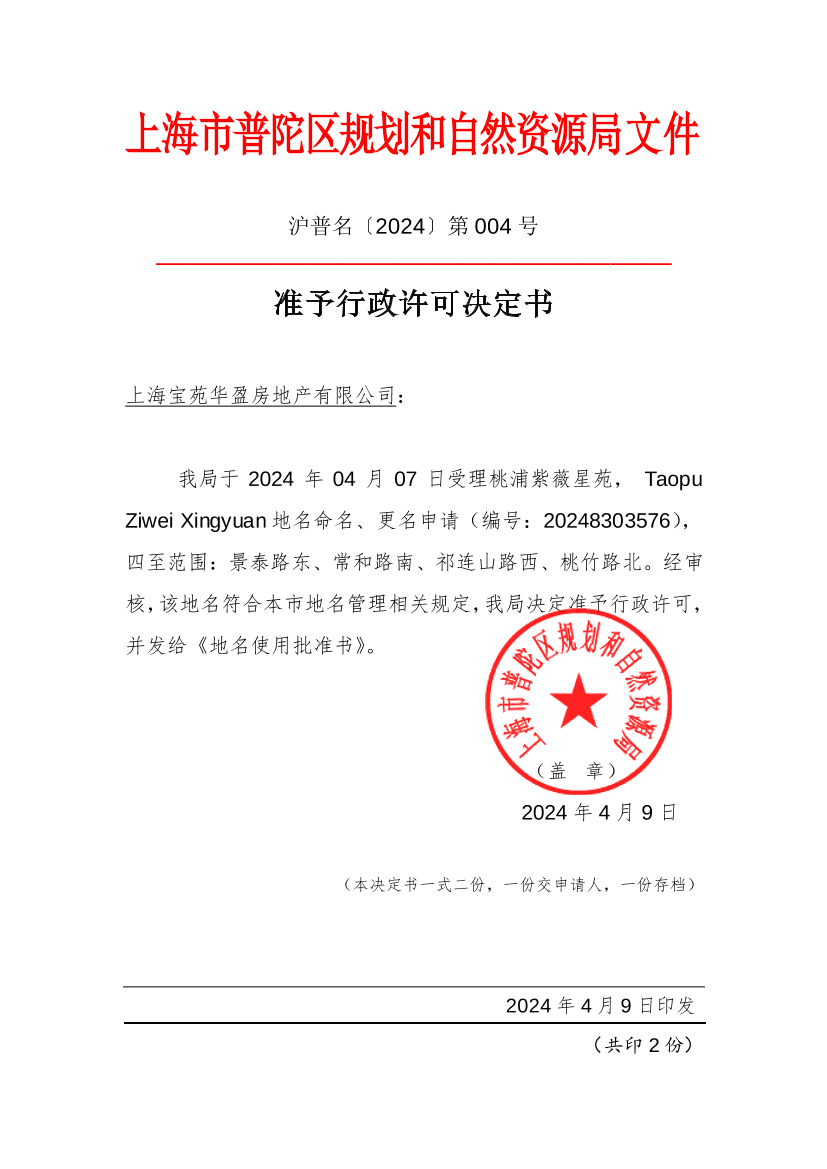 我局于2024年04月07日受理桃浦紫薇星苑,TaopuZiwei Xingyuan地名命名、更名申请(编号:20248303576),四至范围:景泰路东、常和路南、祁连山路西、桃竹路北。经审核,该地名符合本市地名管理相关规定,我局决定准予行政许可,并发给《地名使用批准书》。