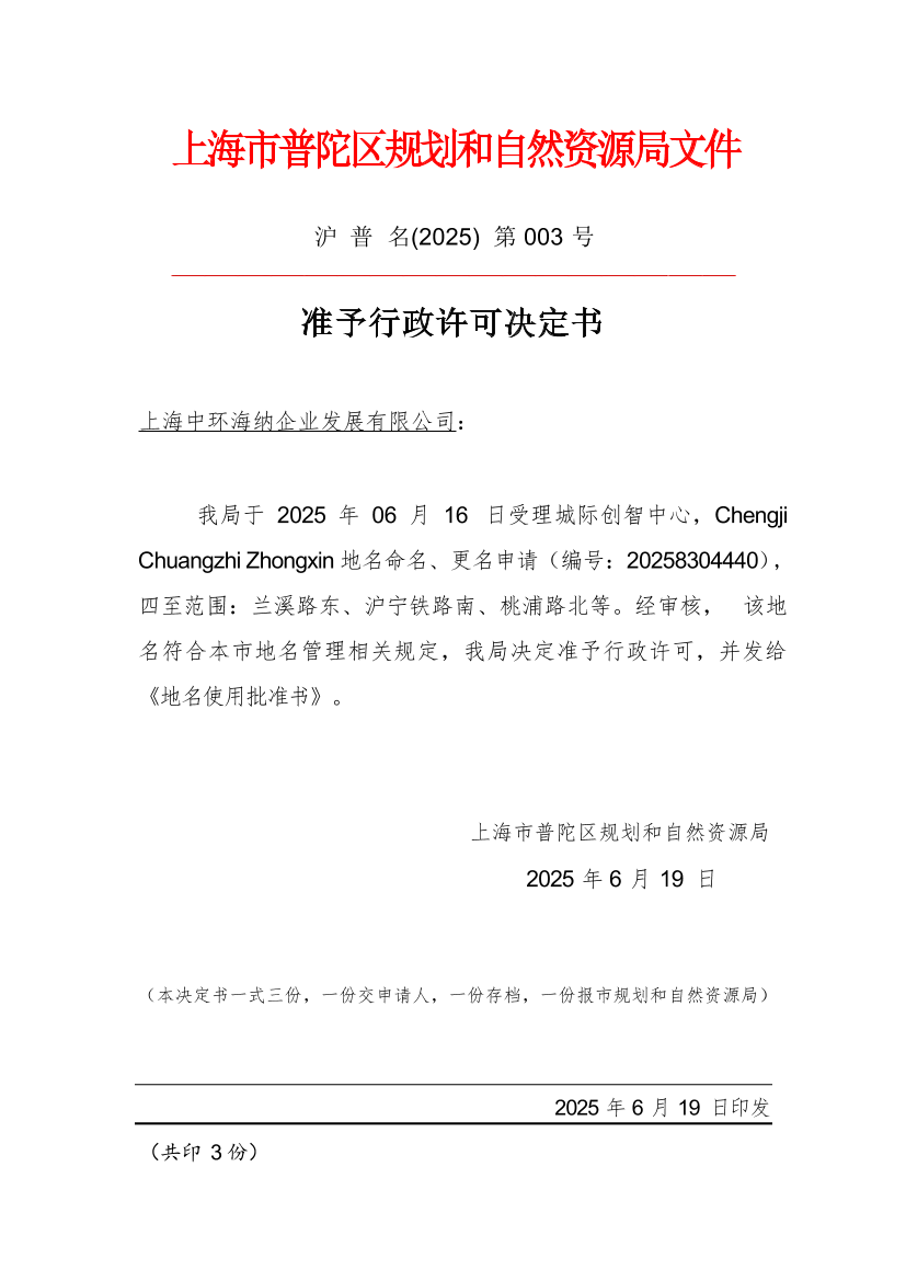 我局于2025年06月16日受理城际创智中心,Chengji Chuangzhi Zhongxin 地名命名、更名申请(编号:20258304440),四至范围:兰溪路东、沪宁铁路南、桃浦路北等。经审核,该地名符合本市地名管理相关规定,我局决定准予行政许可,并发给《地名使用批准书》。