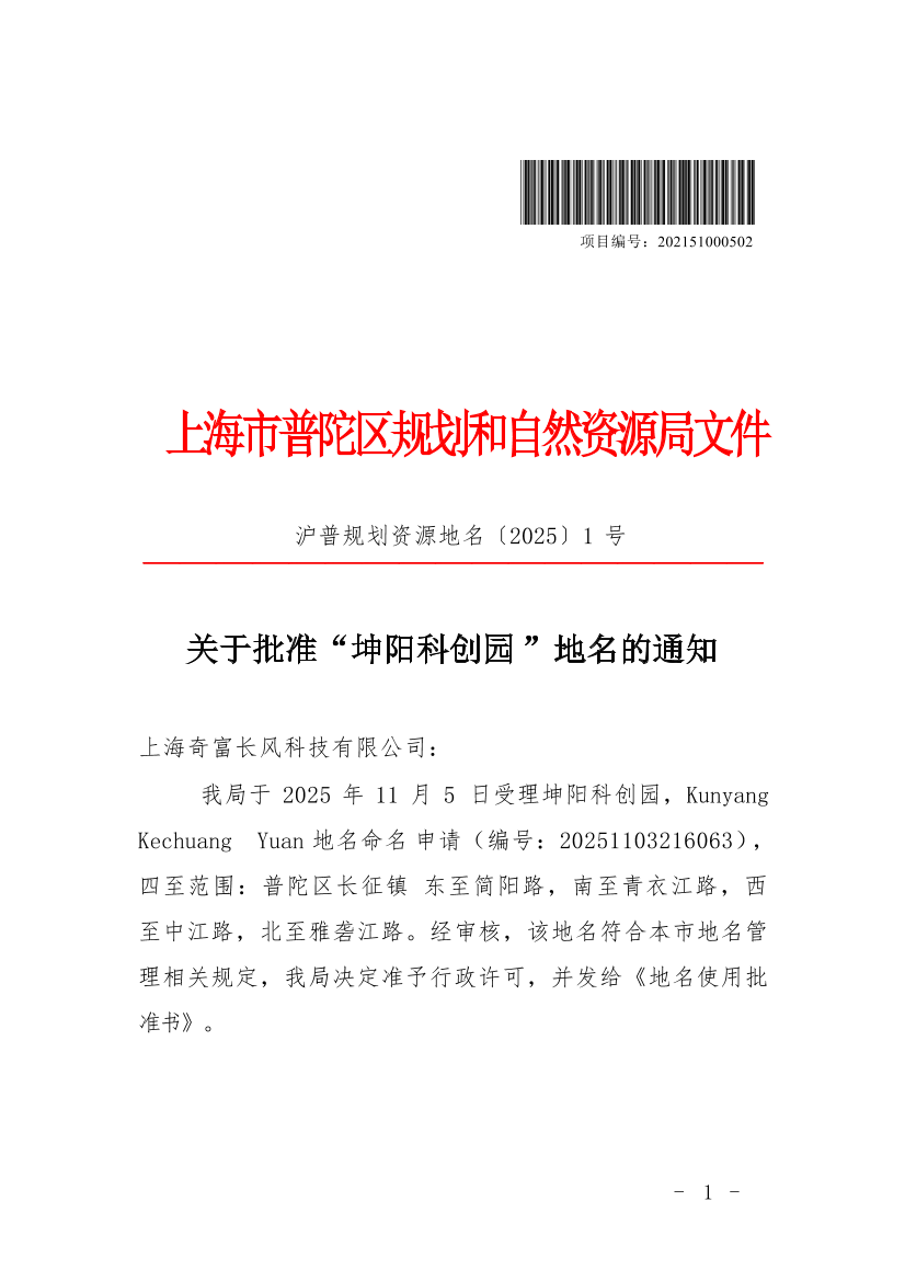 我局于2025年11月5日受理坤阳科创园,Kunyang Kechuang Yuan 地名命名申请(编号:20251103216063),四至范围:普陀区长征镇东至简阳路,南至青衣江路,西至中江路,北至雅砻江路。经审核,该地名符合本市地名管理相关规定,我局决定准予行政许可,并发给《地名使用批准书》。