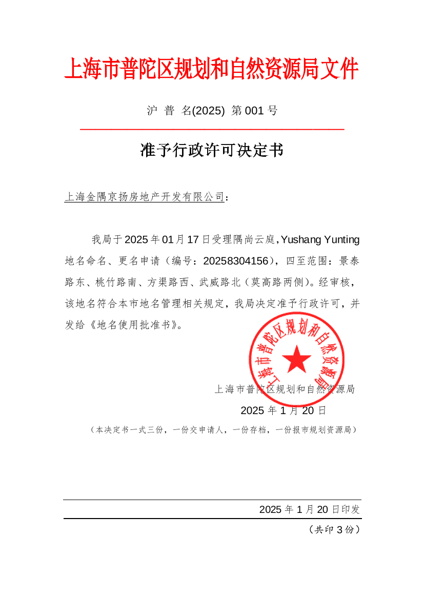我局于2025年01月17日受理隅尚云庭,Yushang Yunting地名命名、更名申请(编号:20258304156),四至范围:景泰路东、桃竹路南、方渠路西、武威路北(莫高路两侧)。经审核,该地名符合本市地名管理相关规定,我局决定准予行政许可,并发给《地名使用批准书》。
