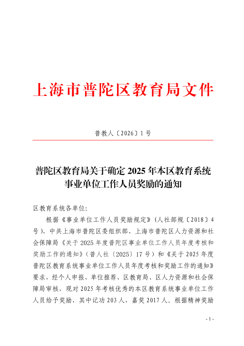 根据《事业单位工作人员奖励规定》(人社部规〔2018〕4号)、中共上海市普陀区委组织部、上海市普陀区人力资源和社会保障局《关于2025年度普陀区事业单位工作人员年度考核和奖励工作的通知》(普人社〔2025〕17号)和《关于2025年度普陀区教育系统事业单位工作人员年度考核和奖励工作的通知》要求,经个人申报、单位推荐、区教育局、区人力资源和社会保障局审核,现对2025年考核优秀的本区教育系统事业单位工作人员给予奖励,其中记功203人,嘉奖2017人。根据精神奖励和物质奖励相结合的原则,奖励记功人员5000元/人、嘉奖人员1500元/人。所需经费由区教育局下达至各单位,不计入工作人员所在单位绩效工资总额。请各单位按照确定后的奖励等次做好《事业单位工作人员奖励审批表》等材料的归档工作。民办学校可参照执行。