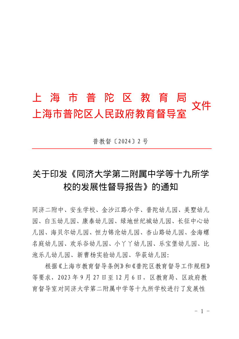 根据《上海市教育督导条例》和《普陀区教育督导工作规程》等要求,2023年9月27日至12月6日,区教育局、区政府教育督导室对同济大学第二附属中学等十九所学校进行了发展性督导,形成了19所学校的发展性督导报告。请各学校加强学习,认真改进落实。