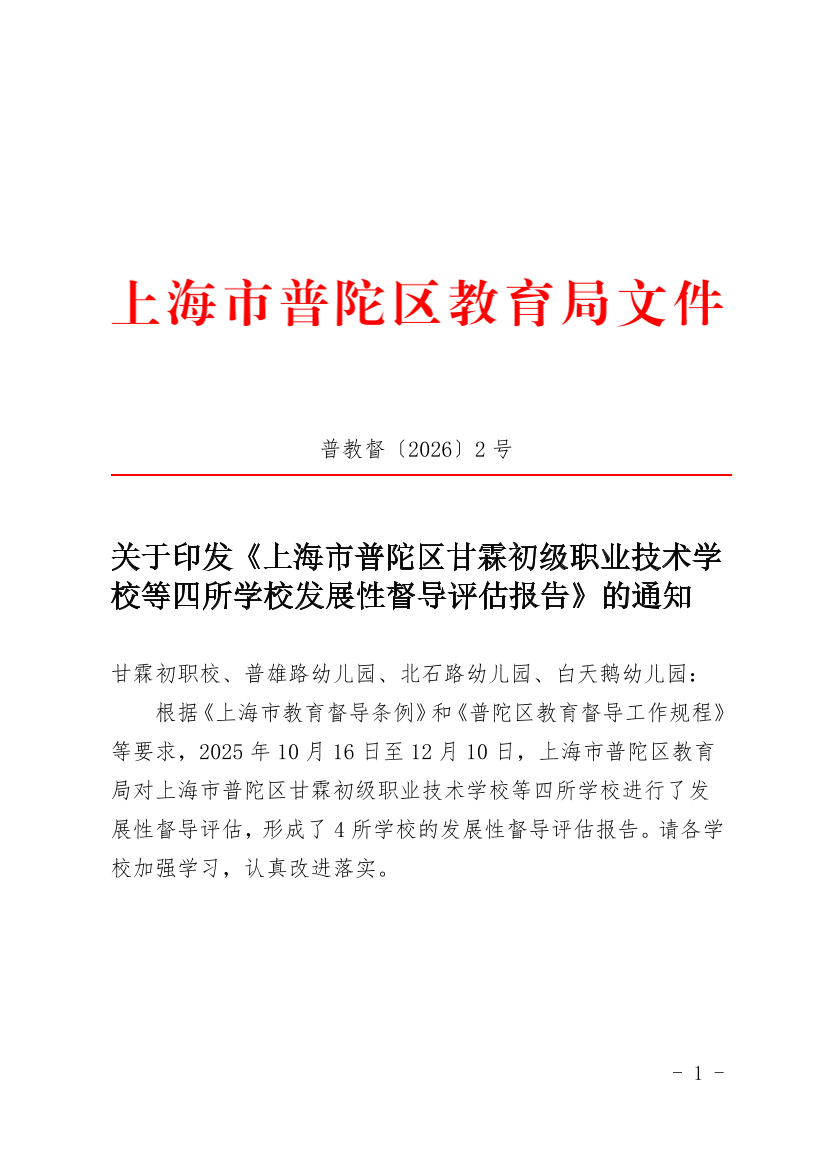 根据《上海市教育督导条例》和《普陀区教育督导工作规程》等要求,2025年10月16日至12月10日,上海市普陀区教育局对上海市普陀区甘霖初级职业技术学校等四所学校进行了发展性督导评估,形成了4所学校的发展性督导评估报告。请各学校加强学习,认真改进落实。