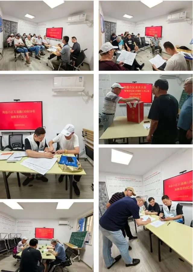 在这样的期盼中,社区内的一位薛爷叔,通过满腔热情和不懈努力,为小区加梯工作开辟了一条新路径。在街道和居民区党总支的帮助下,薛爷叔跑遍相关部门,咨询政策、了解流程,还在楼组里上下奔走,挨家挨户做居民的思想工作。面对居民的种种疑虑和反对,薛爷叔耐心解释,用实际案例说服大家,最终赢得了大多数居民的支持,并成功签约了和平新村居民区的第一台电梯。