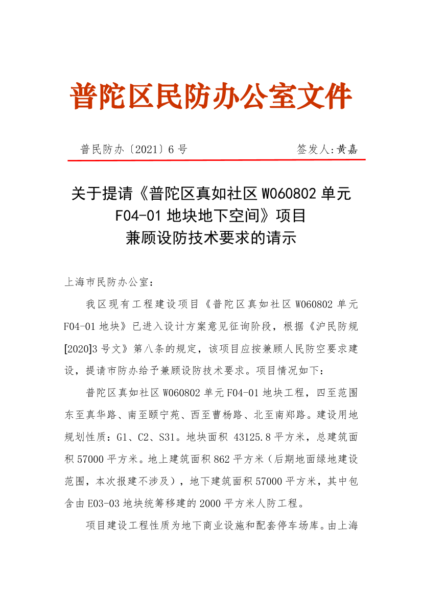 关于提请《普陀区真如社区W060802单元F04-01地块地下空间》项目兼顾设防技术要求的请示