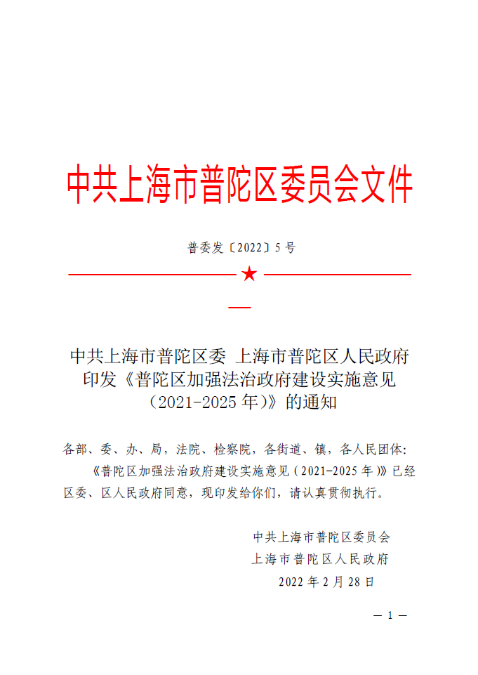 中共上海市普陀区委 上海市普陀区人民政府印发《普陀区加强法治政府建设实施意见(2021-2025年)》的通知