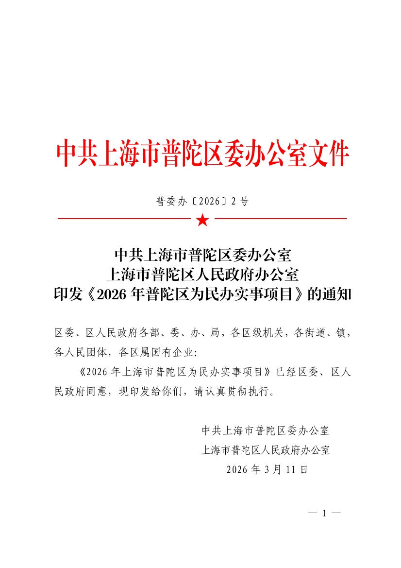 中共上海市普陀区委办公室 上海市普陀区人民政府办公室印发《2026年普陀区为民办实事项目》的通知
