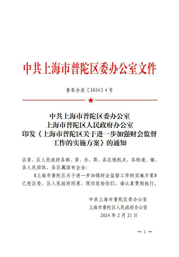 中共上海市普陀区委办公室 上海市普陀区人民政府办公室印发《上海市普陀区关于进一步加强财会监督工作的实施方案》的通知