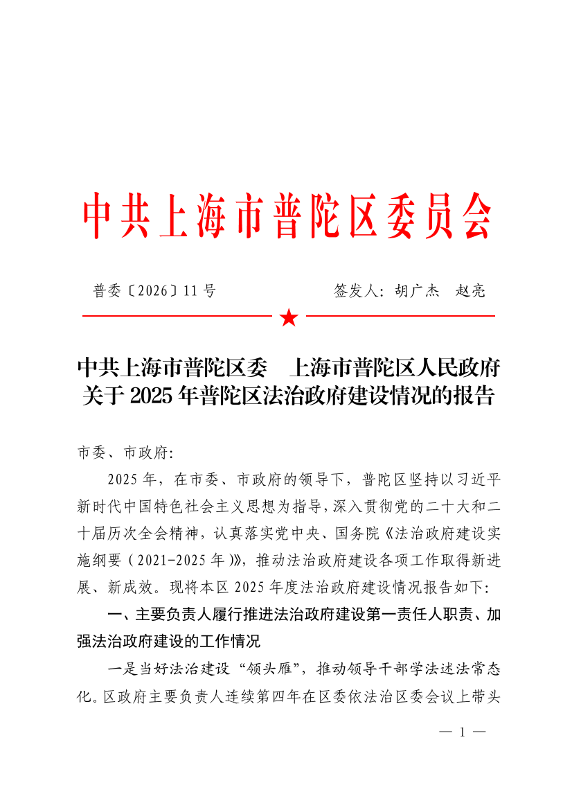 中共上海市普陀区委 上海市普陀区人民政府关于2025年普陀区法治政府建设情况的报告