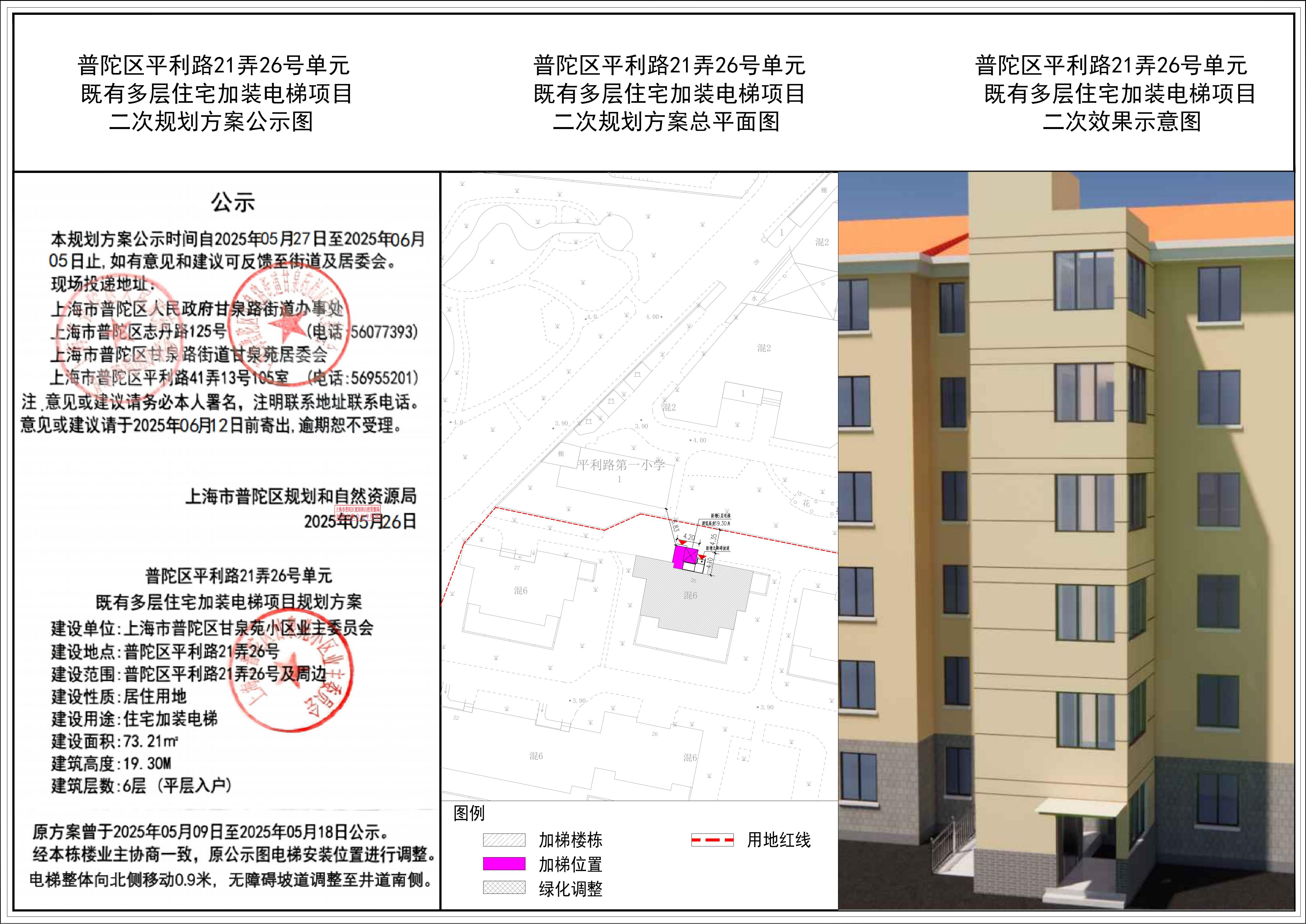 普陀区平利路21弄26号单元既有多层住宅加装电梯项目二次规划方案公示