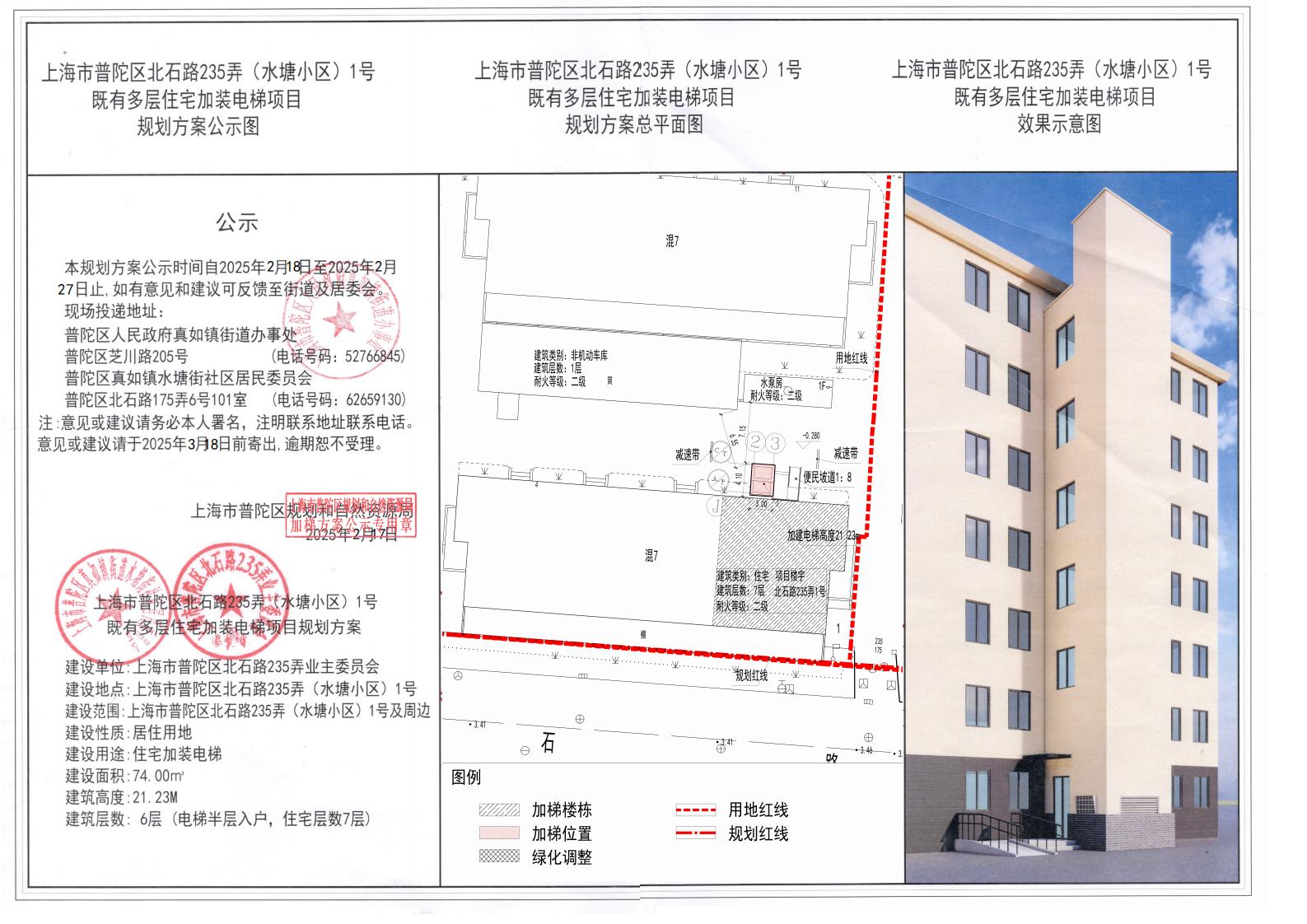 上海市普陀区北石路235弄(水塘小区)1号既有多层住宅加装电梯项目规划方案公示