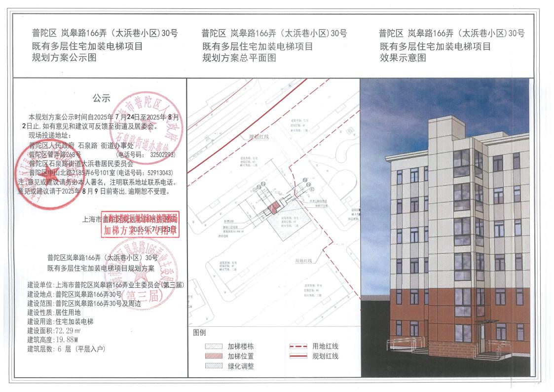普陀区岚皋路166弄(太浜巷小区)30号既有多层住宅加装电梯项目规划方案公示
