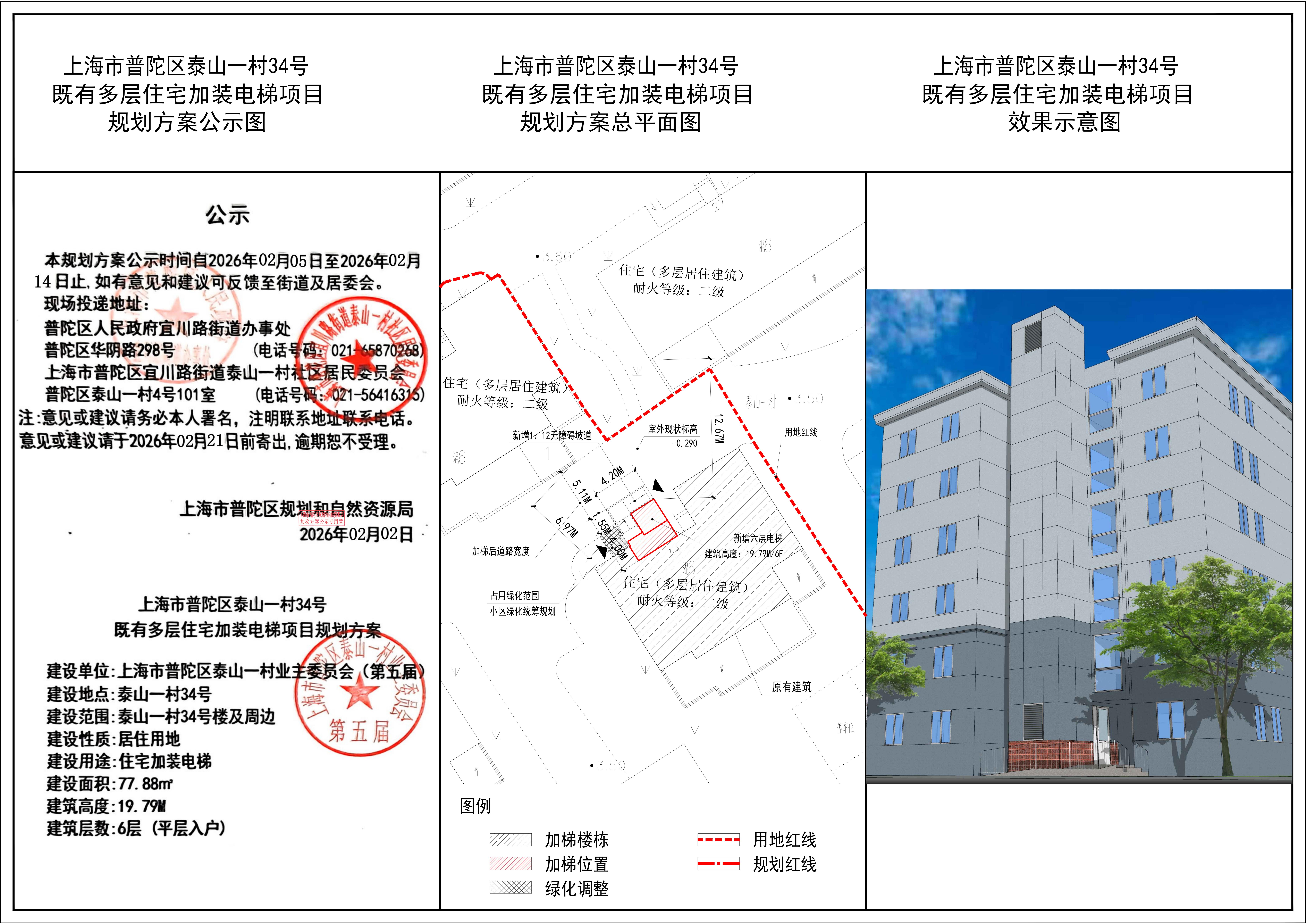 上海市普陀区泰山一村34号既有多层住宅加装电梯项目规划方案公示