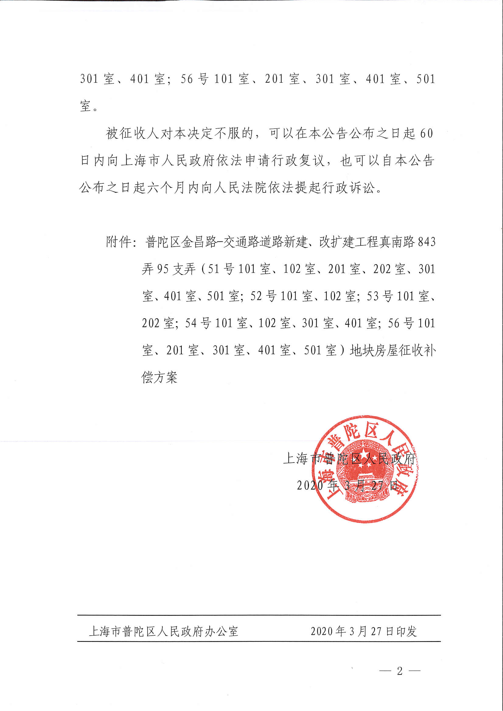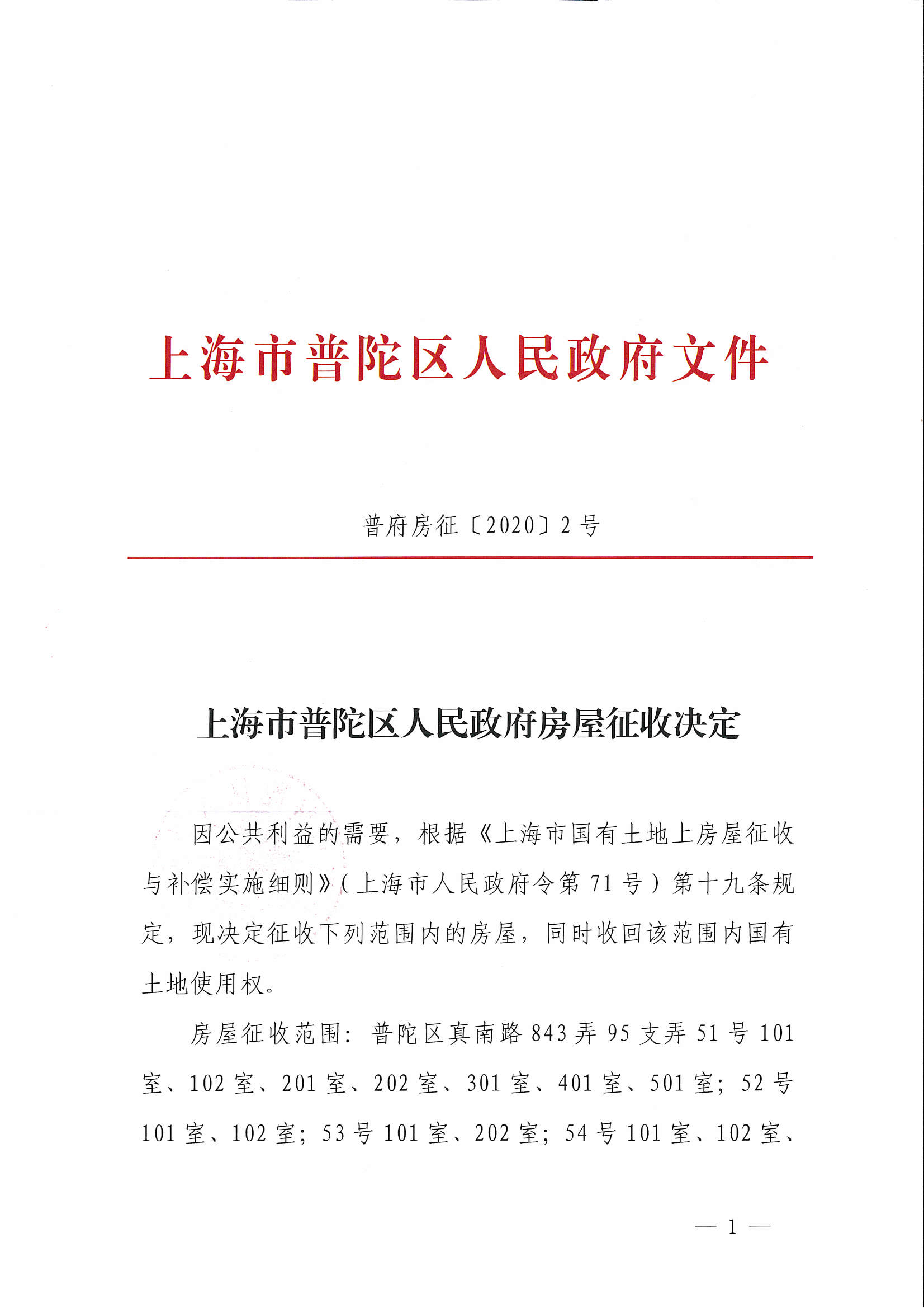 普陀区人民政府房屋征收决定(交通路道路新建、改扩建工程改扩建工程真南路843弄95支弄地块)