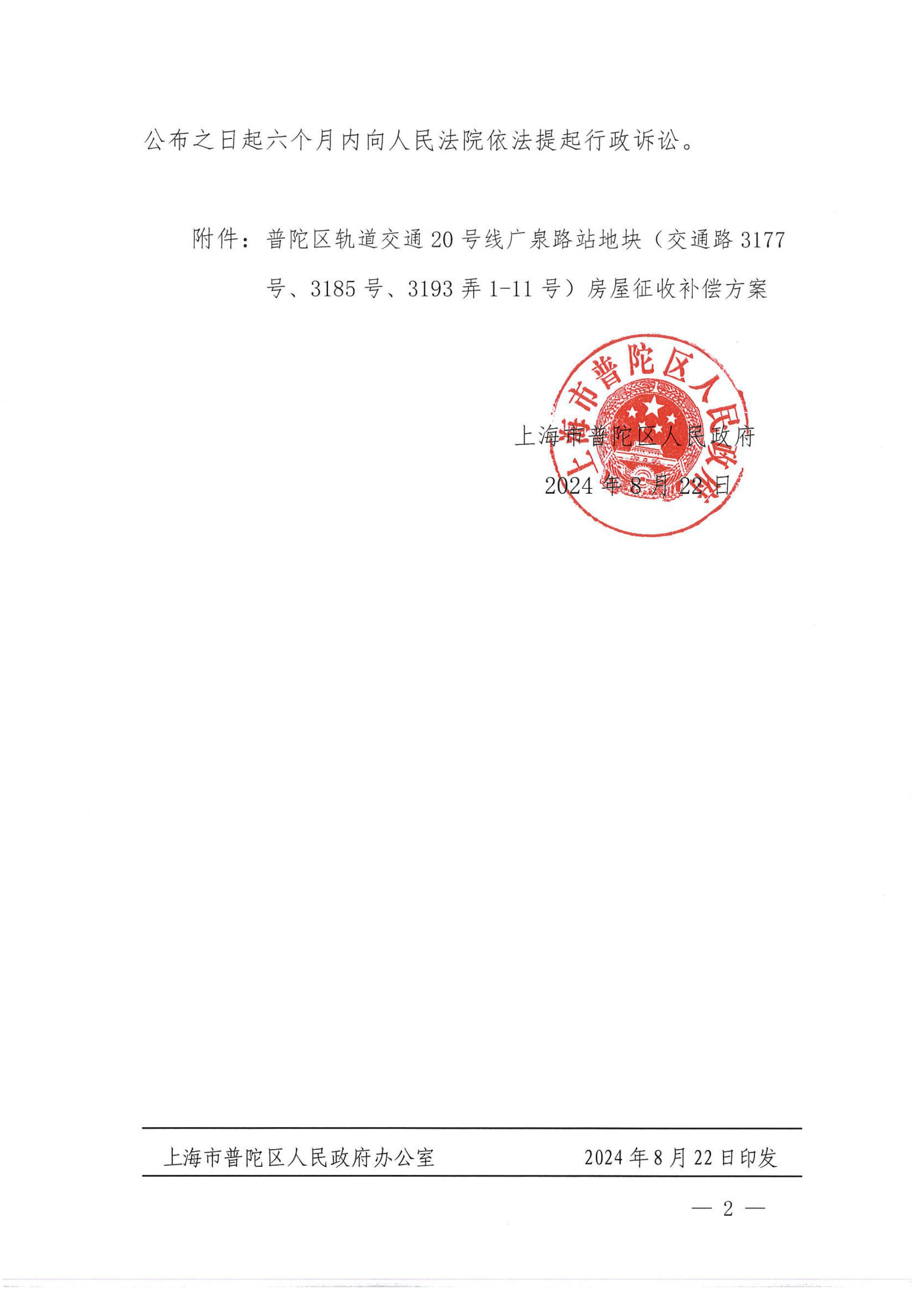 上海市普陀区人民政府房屋征收决定(轨道交通20号线广泉路站地块)