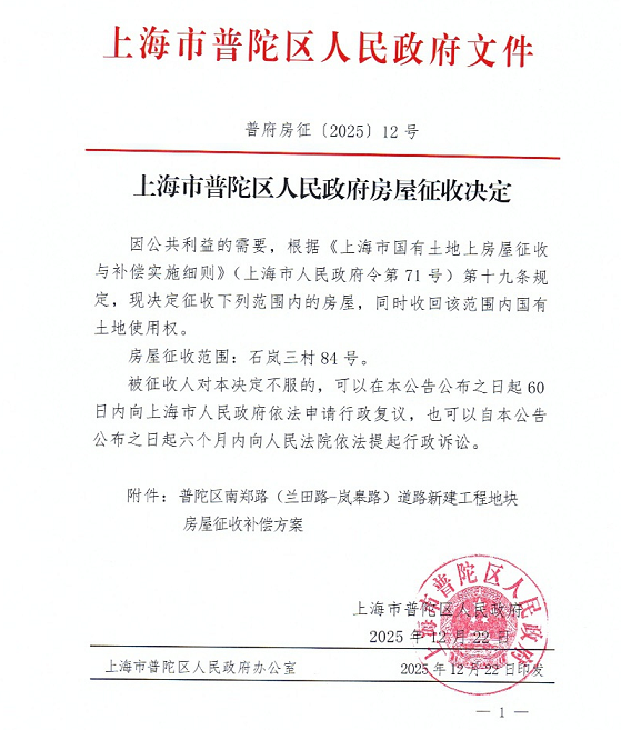 上海市普陀区人民政府房屋征收决定(普陀区南郑路(兰田路-岚皋路)道路新建工程地块)