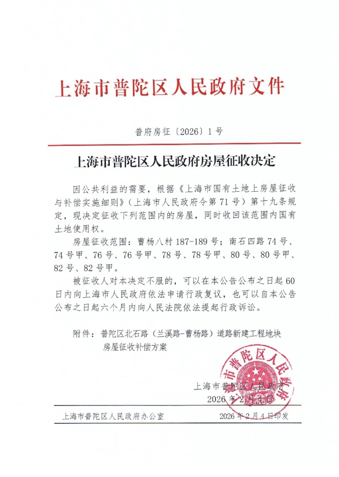 上海市普陀区人民政府房屋征收决定(普陀区北石路(兰溪路-曹杨路)道路新建工程地块)