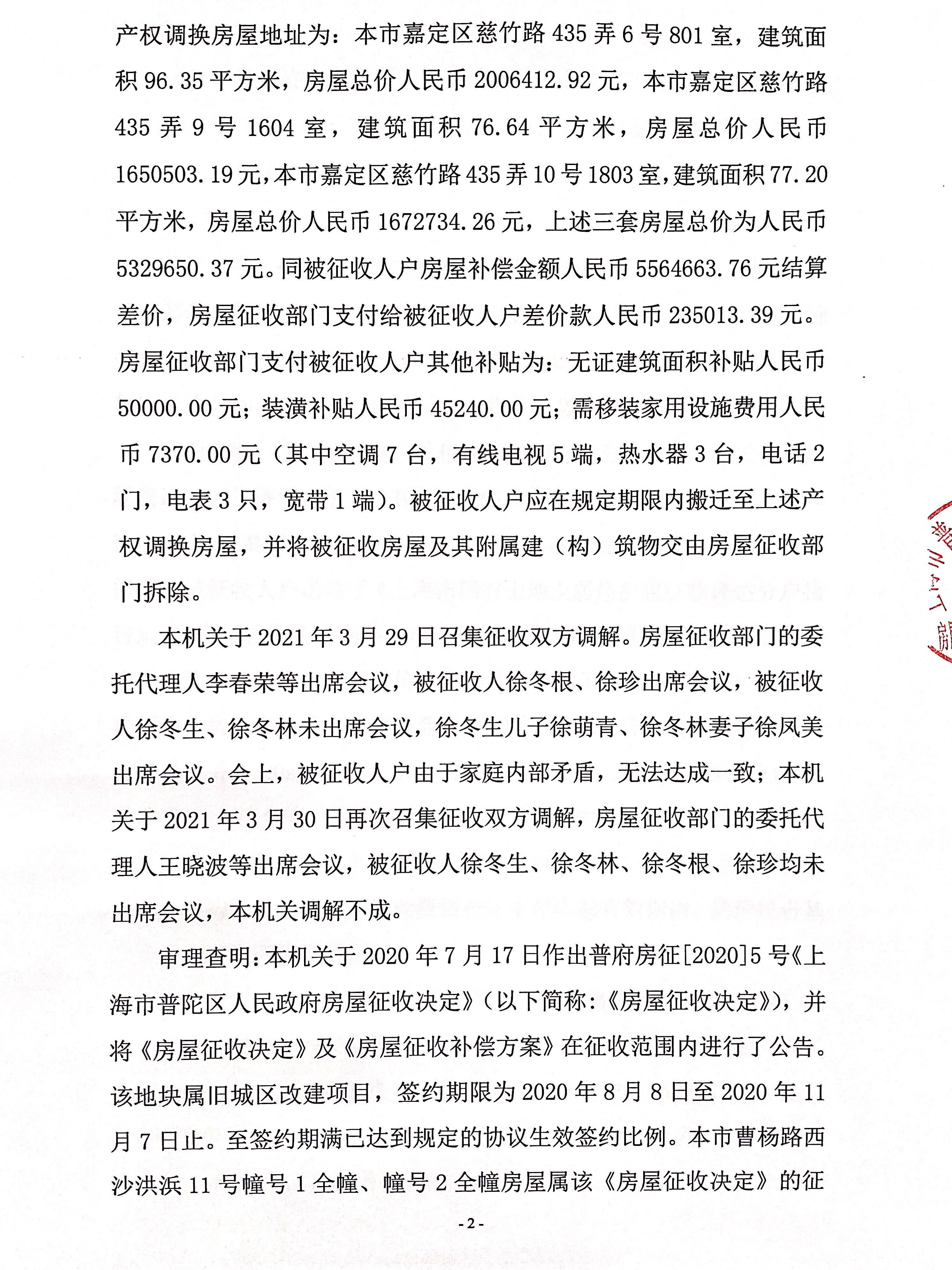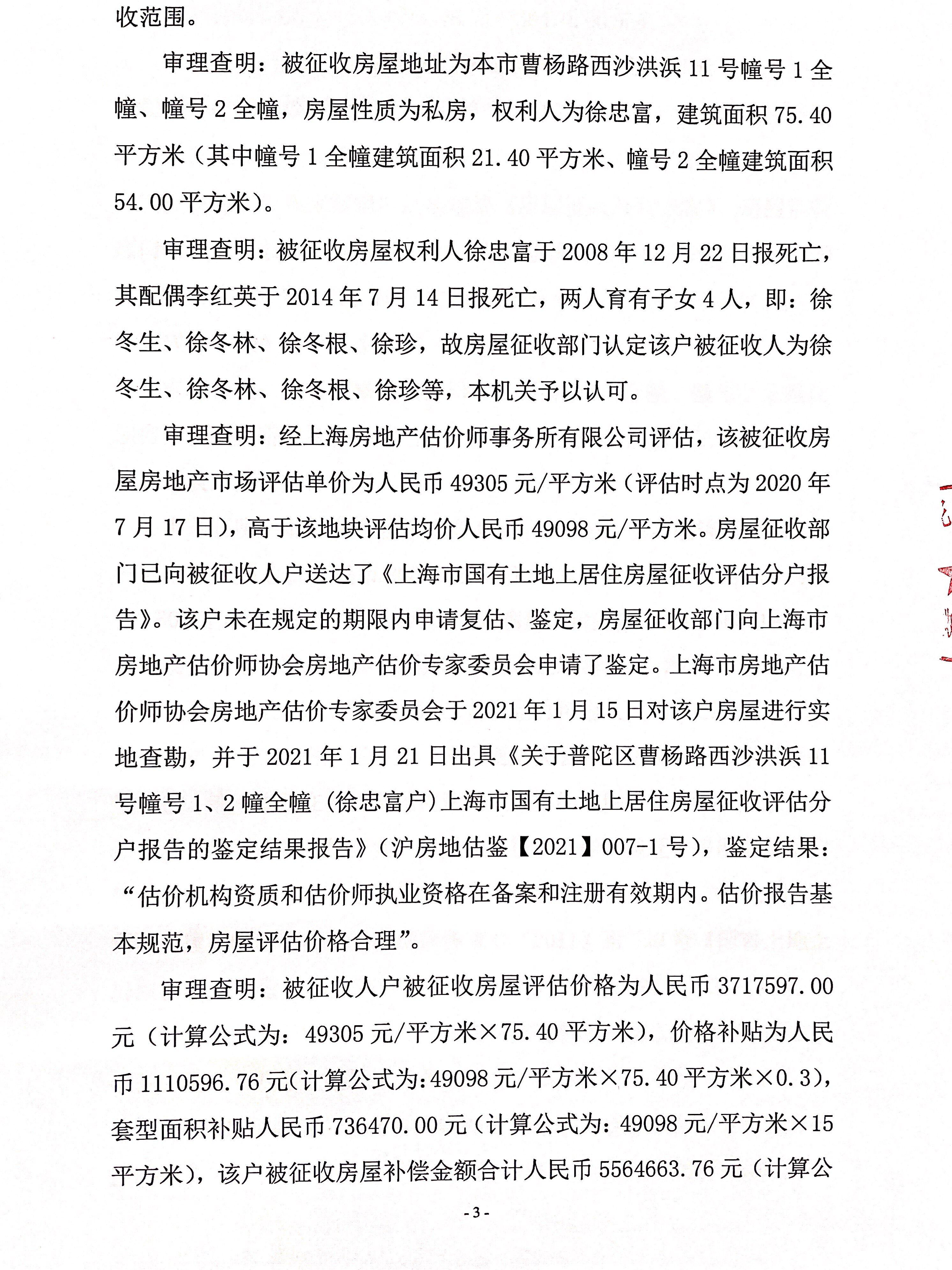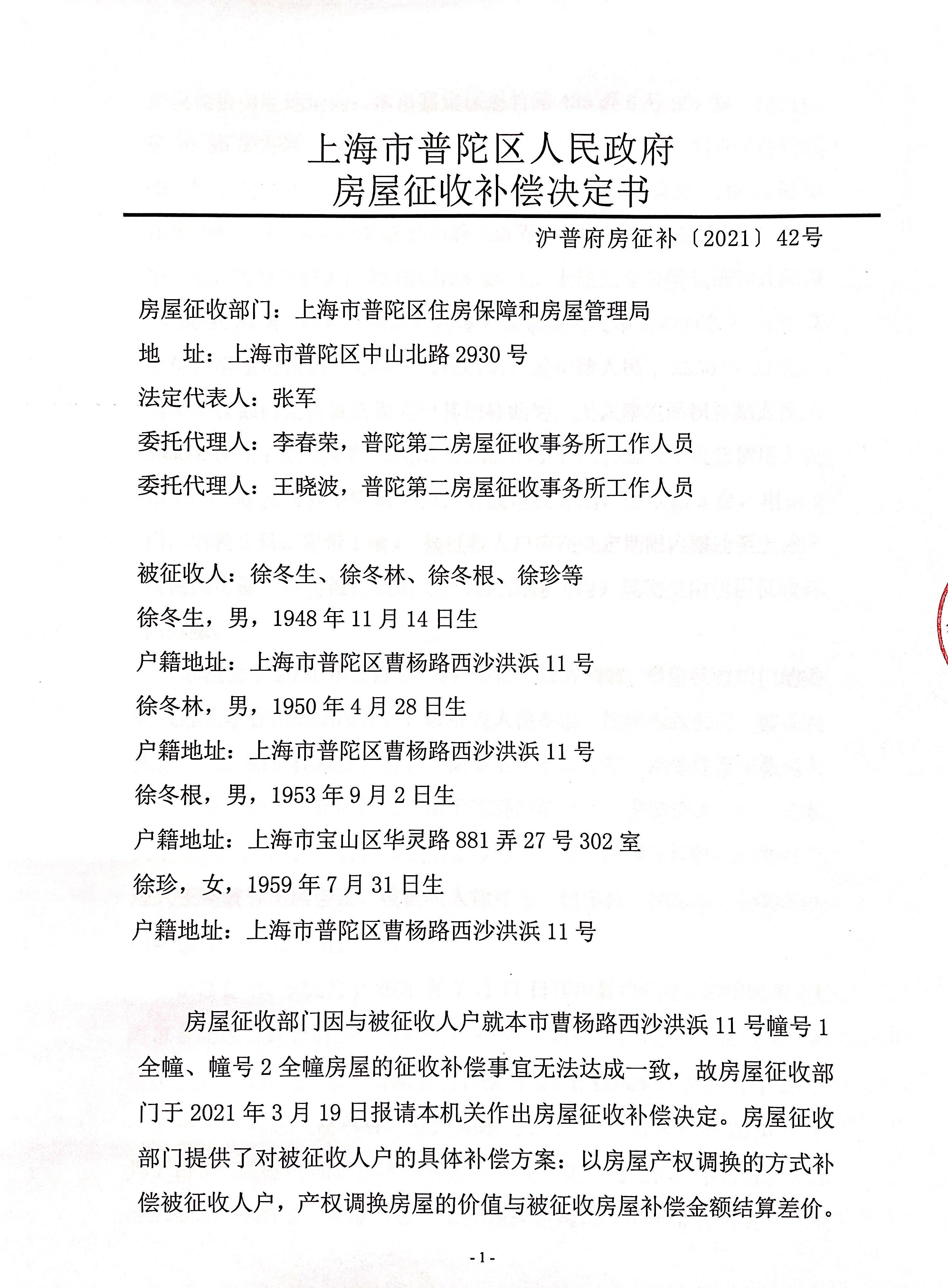 房屋征收补偿决定书(徐冬生、徐冬林、徐冬根、徐珍等)
