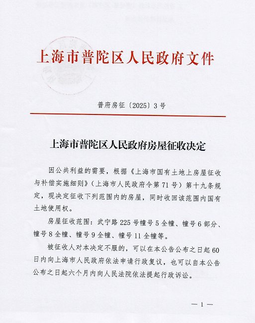 普陀区东新路(曹杨路—武宁路)道路新建工程地块房屋征收决定
