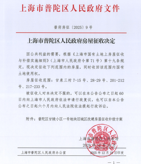 上海市普陀区人民政府房屋征收决定(普陀区甘陵小区一号地块)