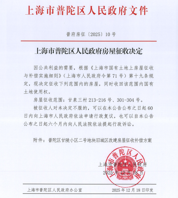 上海市普陀区人民政府房屋征收决定(普陀区甘陵小区二号地块)