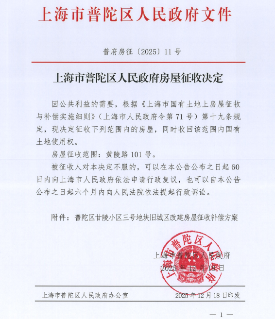 上海市普陀区人民政府房屋征收决定(普陀区甘陵小区三号地块)