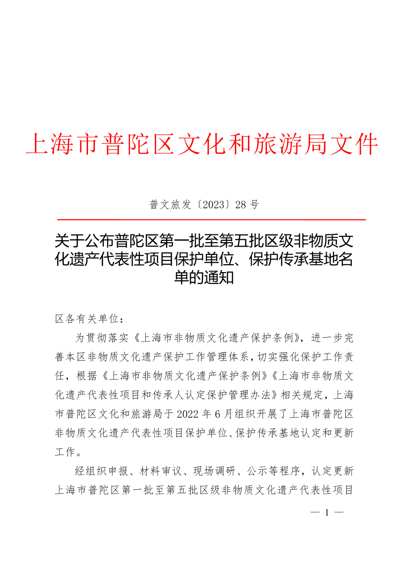 关于公布普陀区第一批至第五批区级非物质文化遗产代表性项目保护单位、保护传承基地名单的通知