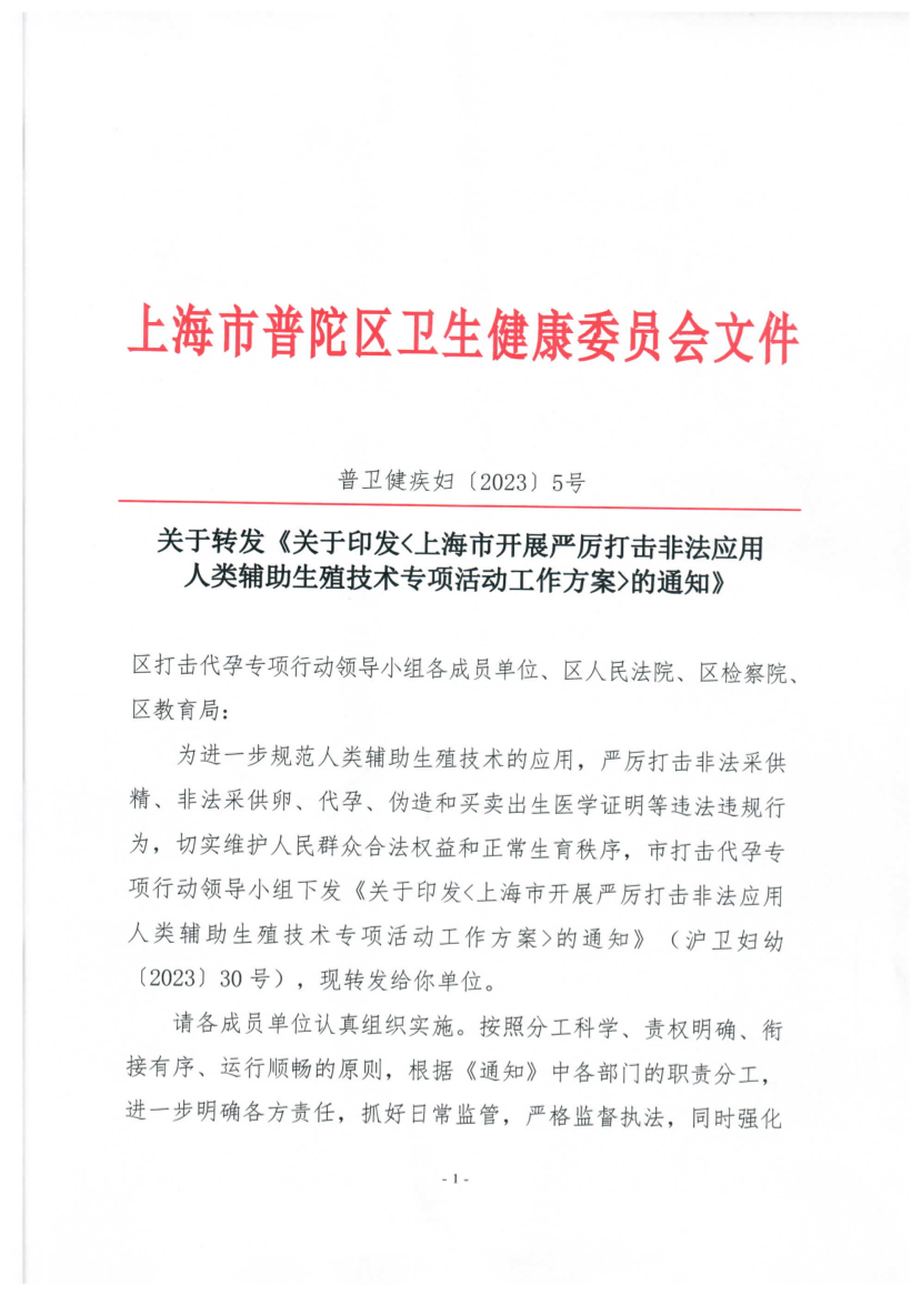 关于转发《关于印发<上海市开展严厉打击非法应用人类辅助生殖技术专项活动工作方案>的通知》