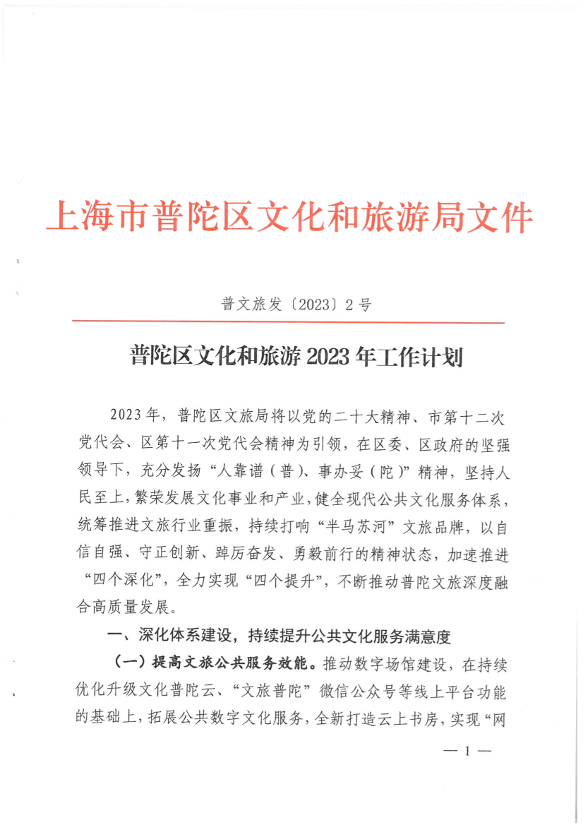 2023年,普陀区文旅局将以党的二十大精神、市第十二次党代会、区第十一次党代会精神为引领,在区委、区政府的坚强领导下,充分发扬“人靠谱(普)、事办妥(陀)”精神,坚持人民至上,繁荣发展文化事业和产业,健全现代公共文化服务体系,统筹推进文旅行业重振,持续打响“半马苏河”文旅品牌,以自信自强、守正创新、踔厉奋发、勇毅前行的精神状态,加速推进“四个深化”,全力实现“四个提升”,不断推动普陀文旅深度融合高质量发展。
