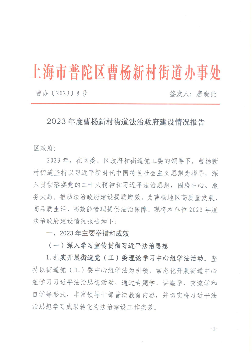 2023年,在区委、区政府和街道党工委的领导下,曹杨新村街道坚持以习近平新时代中国特色社会主义思想为指导,深入贯彻落实党的二十大精神和习近平法治思想,围绕中心、服务大局,推动法治政府建设提质增效,为曹杨地区高质量发展、高品质生活、高效能管理提供法治保障。现将本单位2023年度法治政府建设情况报告如下: