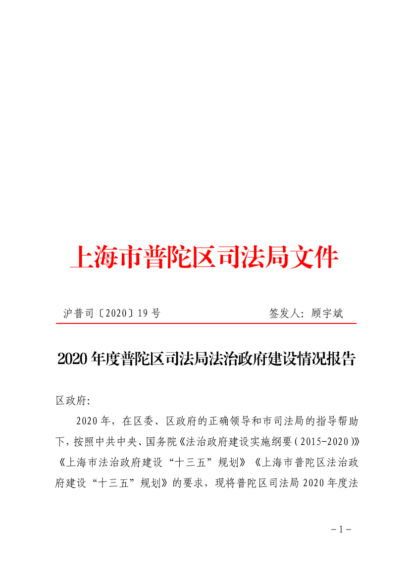 2020年,在区委、区政府的正确领导和市司法局的指导帮助下,按照中共中央、国务院《法治政府建设实施纲要(2015-2020)》《上海市法治政府建设“十三五”规划》《上海市普陀区法治政府建设“十三五”规划》的要求,现将普陀区司法局2020年度法治政府建设情况报告如下: